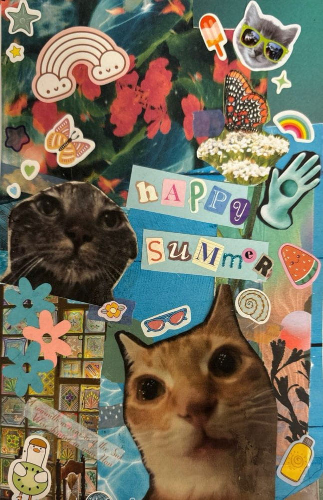 Hi, I'm Callie Shad. I'm from Ellicott City, Maryland, and I've lived there my whole life until starting at Towson. I'm studying graphic design and minoring in mass communications. I chose to major in graphic design because I’m inspired by all forms of art and design- especially typefaces, magazines, collages, photography, and prints. My art often draws inspiration from natural and organic elements, as well as my relationship with the digital world. I tend to make collages, patterns, and illustrations, and graphic design seemed like the best fit for me as a major. As of now, I would ideally like to go into the packaging design field post graduation, but life may take me elsewhere so who knows. If I could go back and major in interdisclipnary or design studies I would probably be a lot less stressed out and creatively bankrupt as I am now, but as a senior its hard not to feel the oncoming pressure to stick to what I've been working towards. I am taking this class to fill a requirement for my GD major, and I would love to learn how to code small animations into my websites this semester. Outside of class in my free time, I love to travel and explore the outdoors, spending time with my partner and friends, as well as just chilling out with the Sims, playing with my cat Hobbes, and listening to some music. I am a full time student, and currently my largest responsibilites outside of maintaining my GPA for my scholarship are balancing taking care of myself, my mental health, my cat, my relationship, and my apartment.
