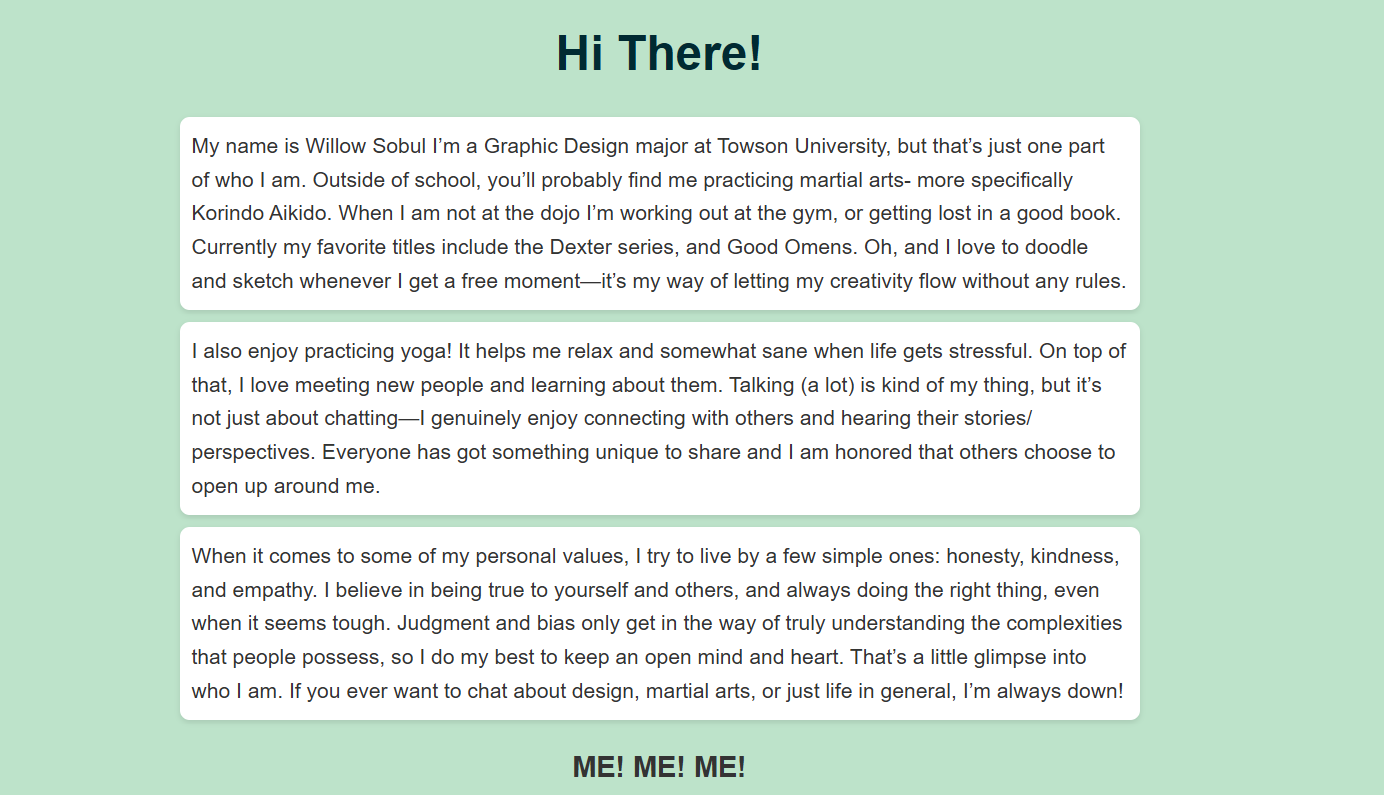 My name is Willow Sobul, I am from Maryland, and I am studying graphic design at Towson University. I graduate from Towson this semester, and I am excited to get my degree soon! I am taking this class because I have to fulfill the requirement—but I am excited to create/design websites for this semester. Outside this semester, I will continue practicing martial arts and working out at the TU gym for fun. Other responsibilities I have to take care of are work, which is at Music and Arts, and family matters.
